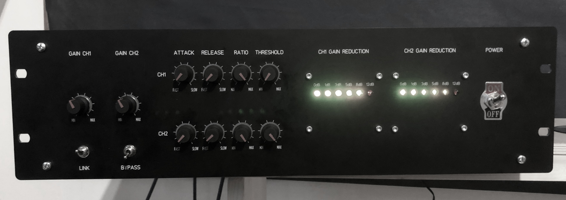 Turn channel 2 threshold down until 8dB led lights up on both channels.